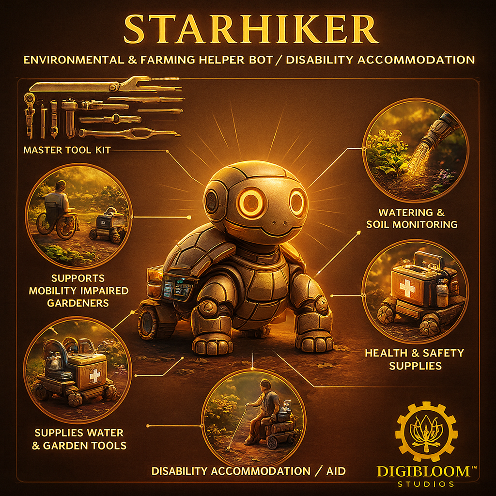 Autonomous mobility, watering, soil monitoring, safety supplies & adaptive support.